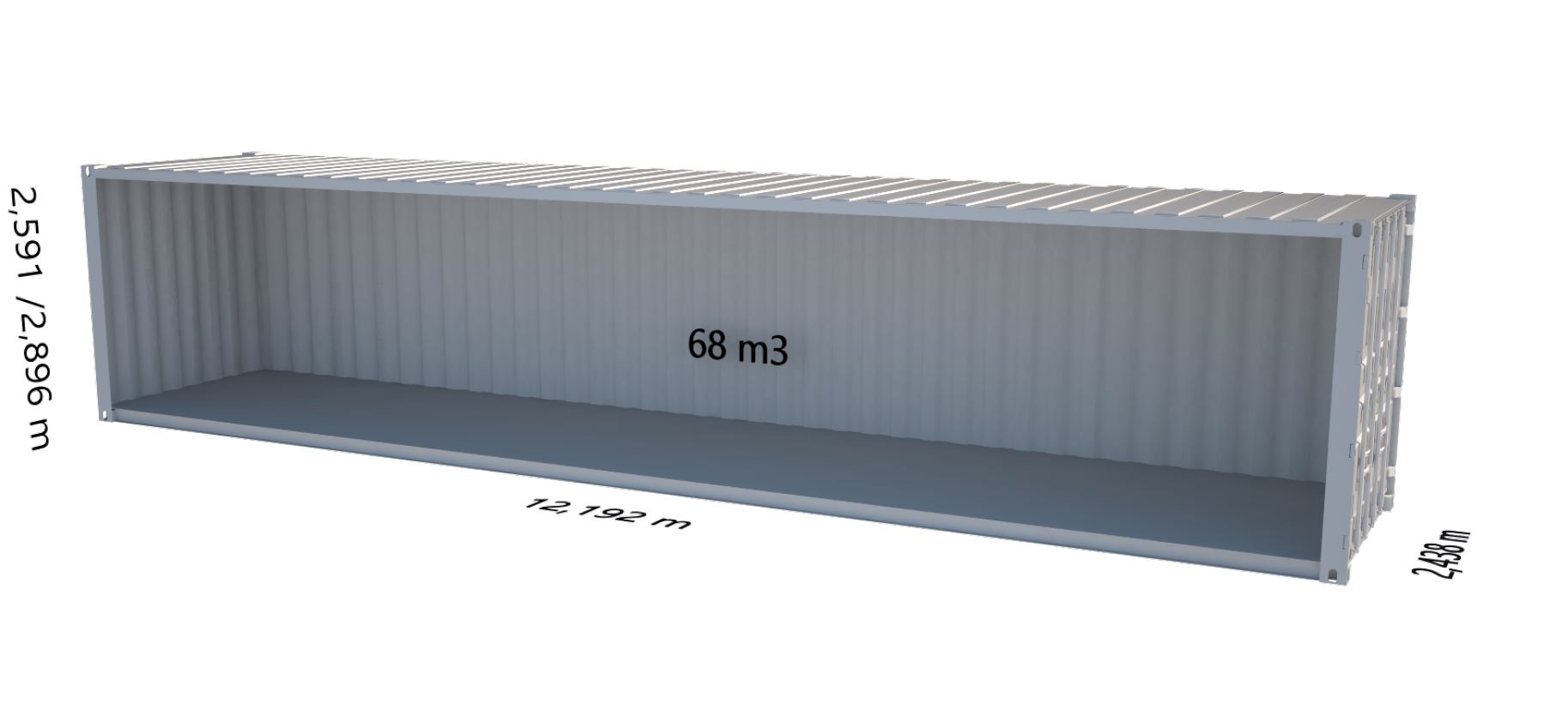| 40' high cube seacontainer | 12,192 | 2,438 | 2,896 | 11,998 | 2,350 | 2,697 |